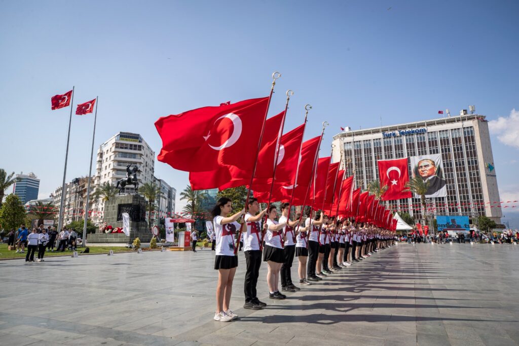 Cumhuriyet Meydanı’ndaki resmi tören, saygı duruşunda bulunulması ve İstiklal Marşı’nın okunmasıyla başladı. Daha sonra konuşma yapan İzmir Gençlik ve Spor İl Müdürü Murat Eskici, sözlerine depremlerde hayatını kaybedenleri anarak başladı. 19 Mayıs’ta Samsun’da yakılan özgürlük ateşinin, Türkiye Büyük Millet Meclisi’nin (TBMM) açılmasıyla birlikte dalga dalga tüm yurda yayıldığını söyledi. Eskici, Mustafa Kemal Atatürk öncülüğünde milli egemenlik ilkesi ile birlik ve bütünlüğün sağması için çarenin ancak millette olduğunun tescillendiğini vurgulayarak, “Büyük ve itibarlı bir ülkede yaşıyoruz. Binlerce şehit vererek büyük özenle kurulan Türkiye Cumhuriyeti, gençlere emanet” dedi.