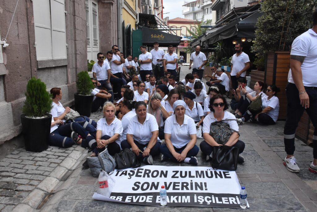 İzmir Büyükşehir Belediyesi bünyesinde taşeron olarak çalışan evde bakım işçileri, İzmir Büyükşehir Belediyesi başkanlık binası önünde kadro talebiyle eylem yaptı. İşçiler, ‘Taşeron zulmüne son verin’ yazılı pankart açıp, oturma eylemi yaptı.