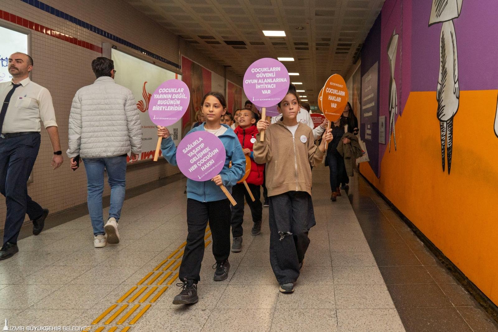 Çocukların kent yaşamında hak farkındalığını güçlendirmek amacıyla oluşturulan rotada metro, tramvay ve vapura binen çocuklar, ellerindeki “Her çocuk eşittir”, “Oyun oynamak hakkımız”, “Eğitim her çocuğun hakkı”, “Çocukları şiddet, ihmal ve istismardan koruyun” yazılı dövizlerle taleplerini ve haklarını dile getirdi.