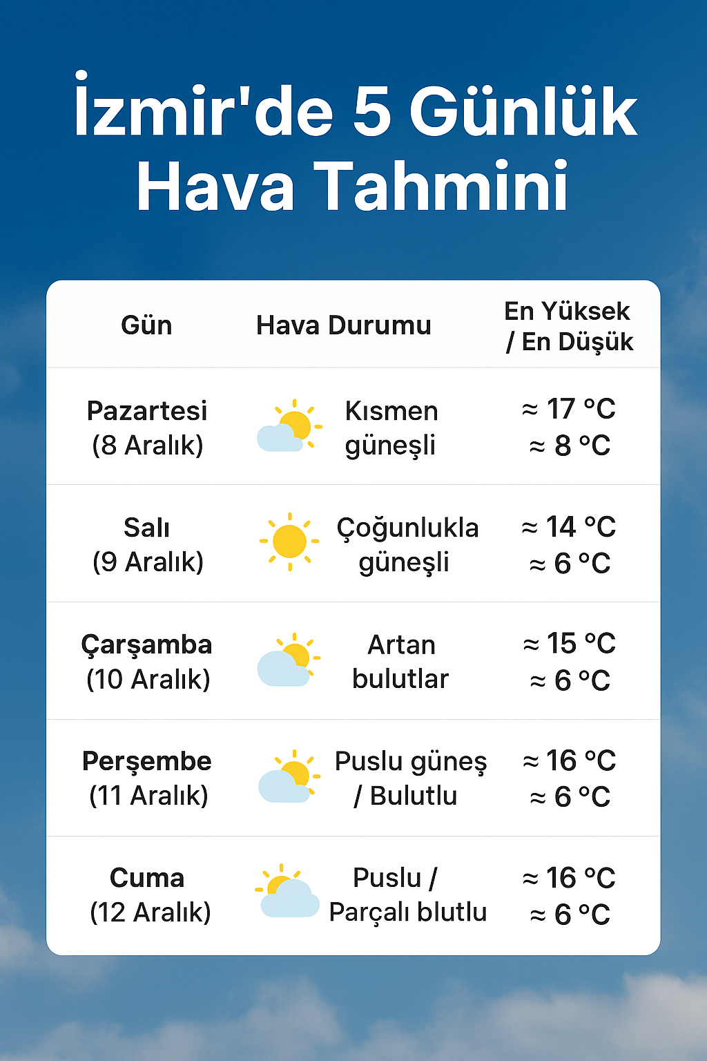 DEMOKRAT GÜNDEM-HABER MERKEZİ-İzmir’de 8 Aralık Pazartesi günü hava, sabah saatlerinde parçalı bulutlu geçecek. Sabah 9–10 °C civarındaki sıcaklık, öğle saatlerinde 15–17 °C bandına yükselirken, gün boyu yağış beklenmiyor.