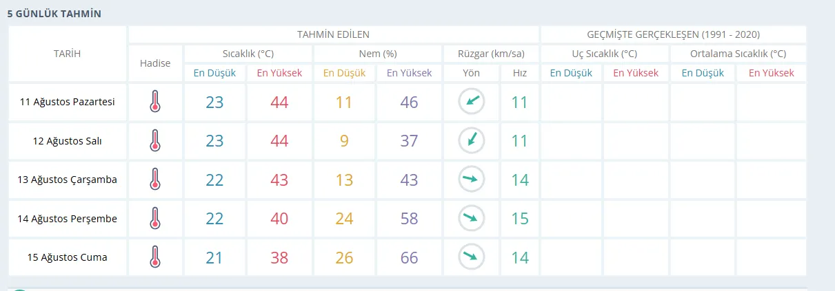 İzmir’de 5 Günlük Hava Tahmini (11–15 Ağustos 2025):