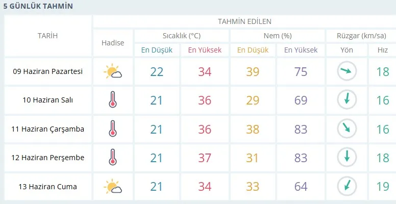 Meteoroloji Genel Müdürlüğü verilerine göre İzmir’de hava sıcaklıkları önümüzdeki hafta 37 dereceye kadar yükselecek; Kurban Bayramı’nın son günü 34 derece ile başlayan sıcak hava dalgası, perşembe günü zirve yapacak; deniz suyu sıcaklıkları ise merkez bölgelerde 24 dereceyi aşacak