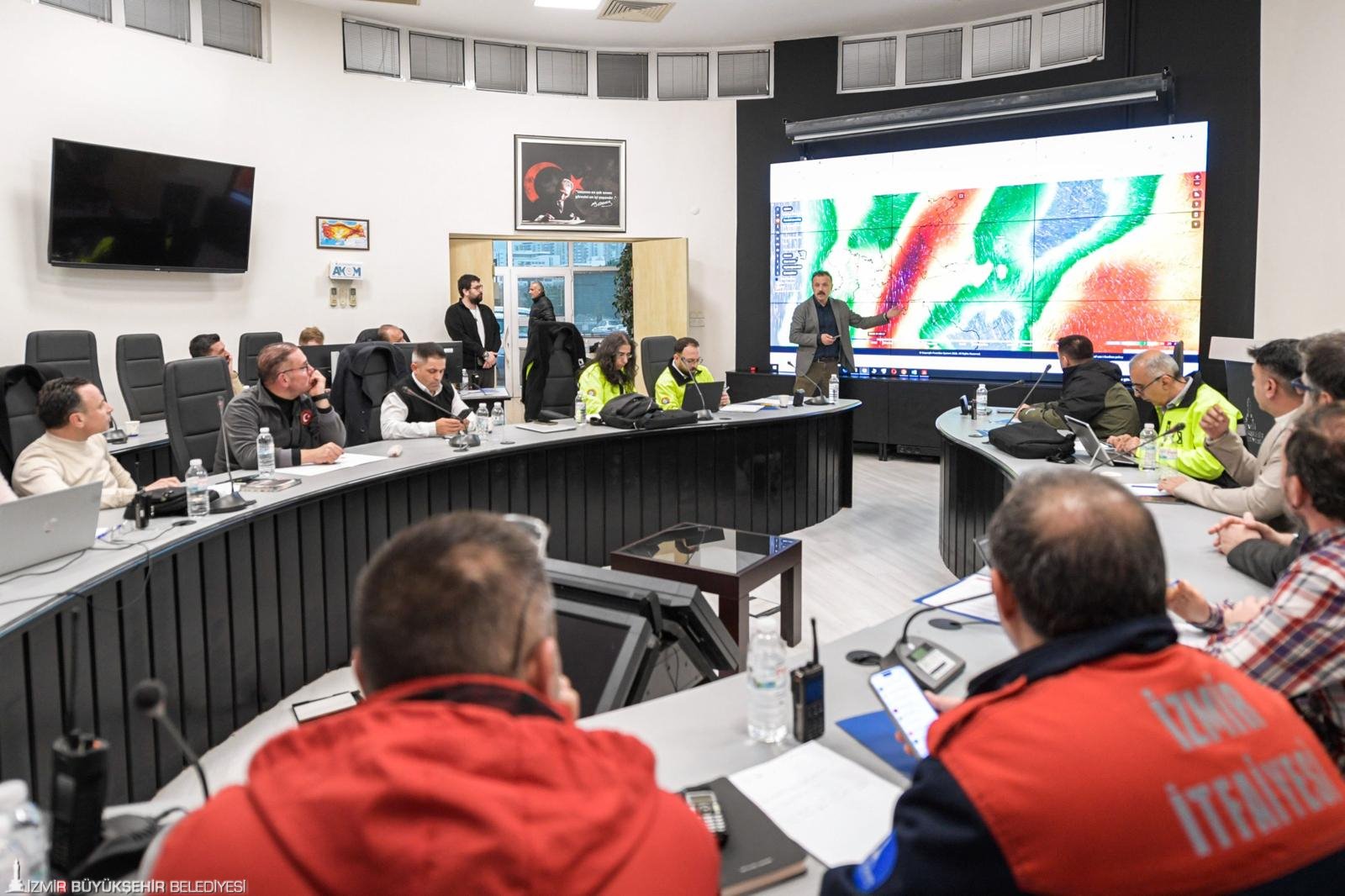 İzmir için verilen turuncu alarm nedeniyle İzmir Büyükşehir Belediyesi tarafından Afet Koordinasyon Merkezi Şube Müdürlüğü’nde (AKOM) kriz masası kuruldu.