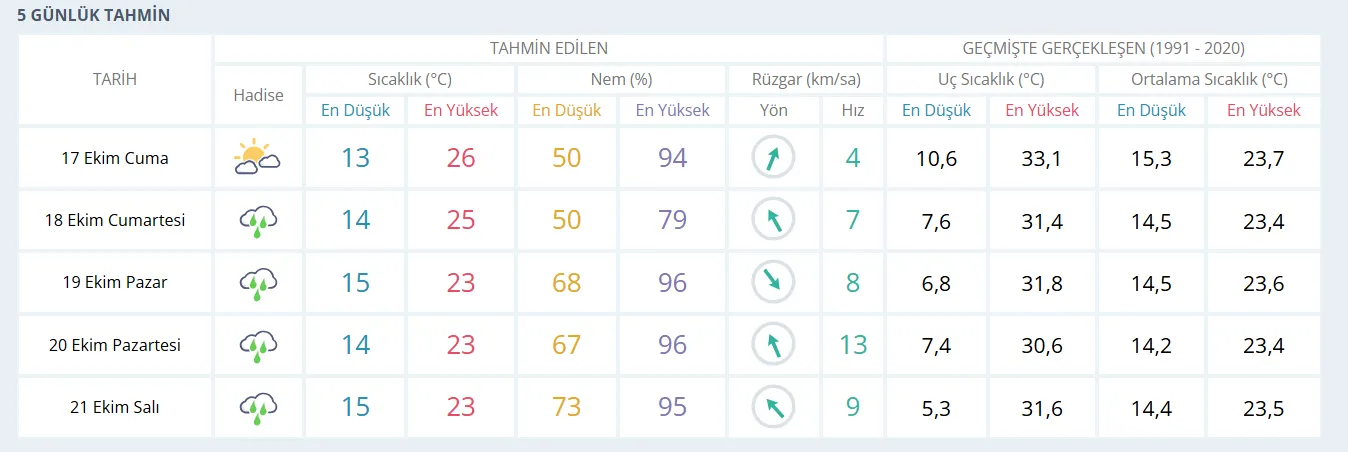 Tahminlere göre, 17 Ekim Cuma günü İzmir’de hava parçalı ve az bulutlu, sıcaklık ise 26 derece civarında olacak. Ancak 18 Ekim Cumartesi günü itibarıyla sağanak yağışlar başlayacak ve sıcaklık 25 dereceye gerileyecek.