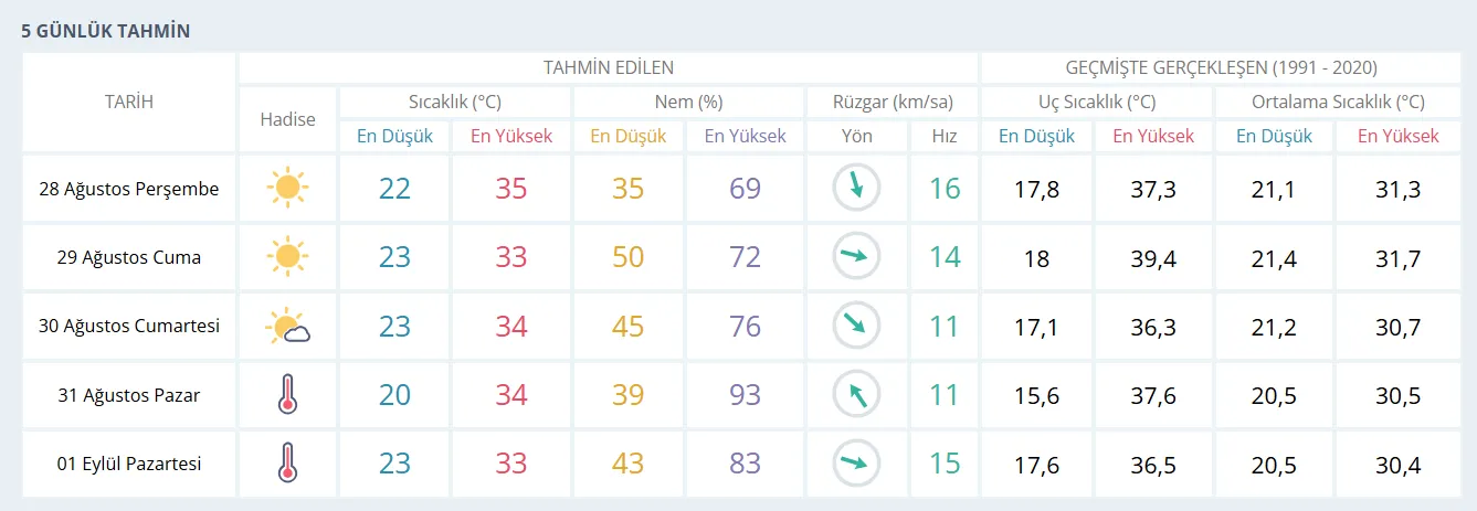 Haftaya 35°C seviyelerinde başlayan İzmir’de sıcaklıklar, 29 Ağustos Cuma günü 33°C’ye kadar düşecek. Hafta sonu ise 30 Ağustos Zafer Bayramı’nın kutlanacağı Cumartesi günü ve 31 Ağustos Pazar günü termometrelerin 34°C’yi göstermesi bekleniyor.