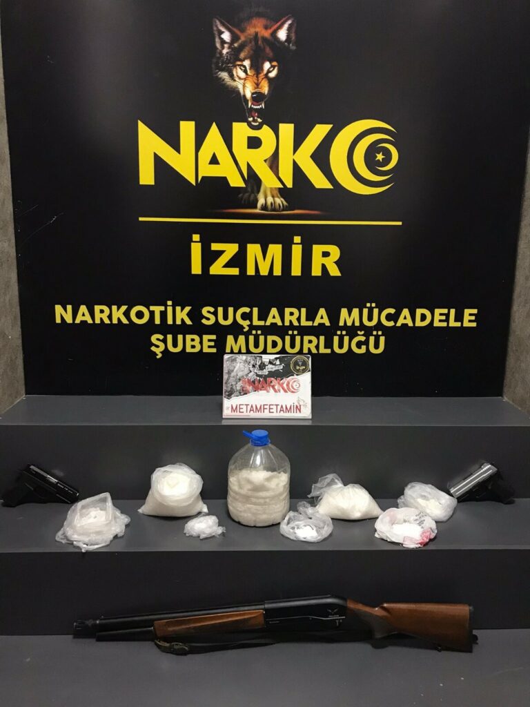 İZMİR’de polisin düzenlediği baskınlarda 5 kilo 403 gram metamfetamin, ruhsatsız 3 tabanca, 1 tüfek ve 70 fişek ele geçirildi. Gözaltına alınan 1 şüpheli, tutuklandı.