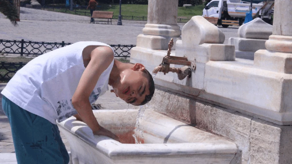 Sıcaktan bunalan yurttaşlar, çareyi çeşme başında serinlemekte buldu.