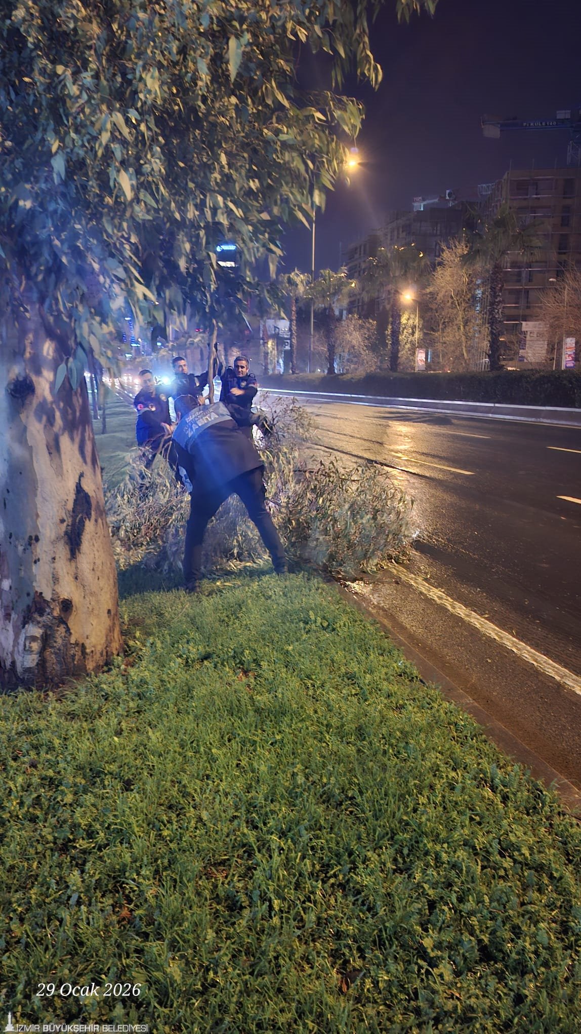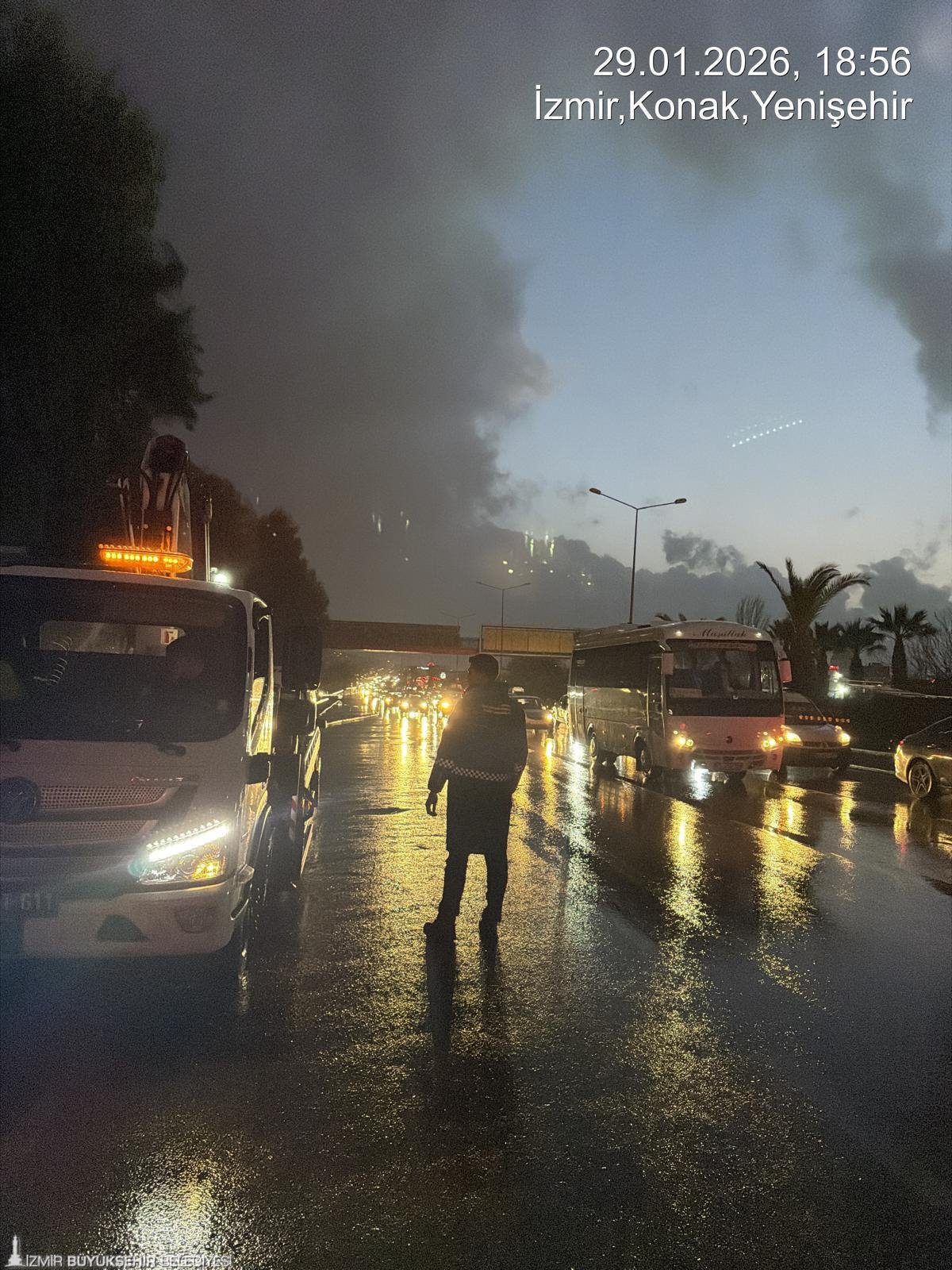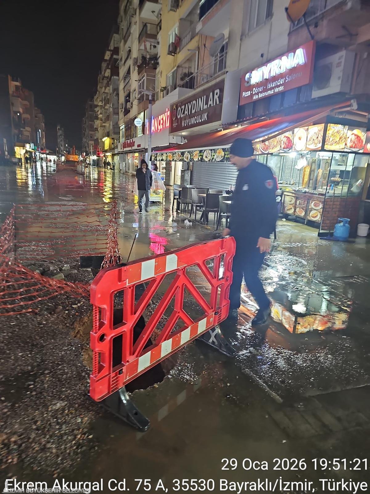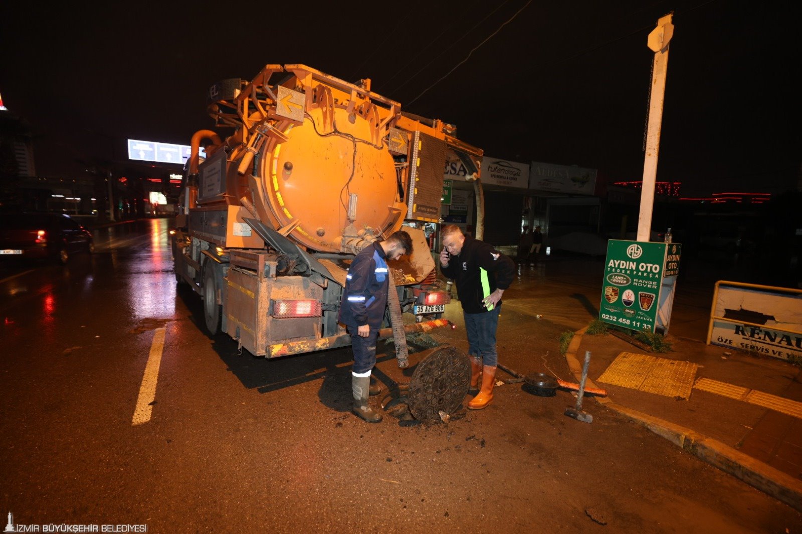 İzmir Büyükşehir Belediyesi Yol Yapım, Bakım ve Onarım Dairesi Başkanlığı, yağışın gece saatlerinde etkili olmaya başlamasıyla birlikte 4 ekip, 21 personel ve çok sayıda araçla sahada çalışma yürüttü.