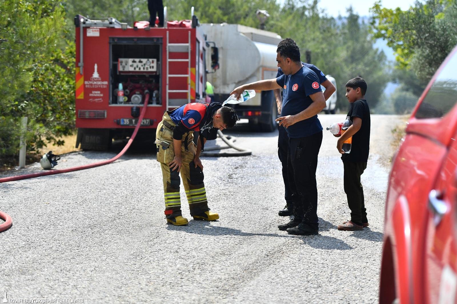Bölgede soğutma çalışmaları sürüyor. İzmir Büyükşehir Belediyesi Veteriner İşleri Dairesi Başkanlığı ekipleri de bölgede hayvanların tahliye edilmesi ihtimaline karşı hazır bekledi.