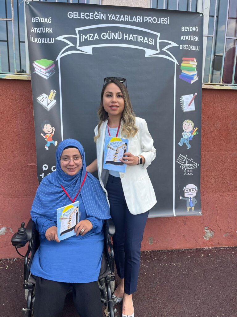 Beydağ ilçesindeki Atatürk Ortaokulu öğrencilerinin ‘Geleceğin Yazarları Projesi’ kapsamında çıkardığı ‘Yeniden Umut’ adlı kitaba 8 yıl önce aynı okuldan mezun olan bedensel engelli Nurten Göksel de iki eseriyle destek verdi.