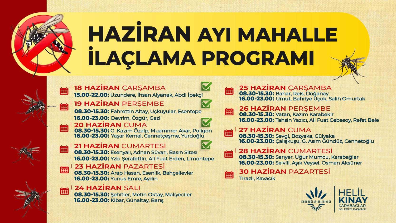 18 Haziran’dan bu yana devam eden çalışmalarda, şimdiye kadar Uzundere, Abdi İpekçi, İhsan Alyanak, Fahrettin Altay, Üçkuyular, Esentepe, Devrim, Özgür, Gazi, General Kazım Özalp, Muammer Akar, Poligon, Yaşar Kemal, Cennetçeşme, Yurdoğlu, Esenyalı, Adnan Süvari, Basın Sitesi, Yüzbaşı Şerafettin, Ali Fuat Erden ve Limontepe mahalleleri köşe bucak ilaçlandı.