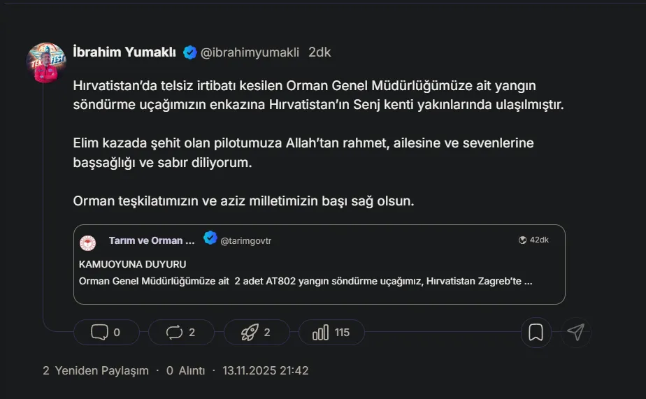 Bakan Yumaklı, “Hırvatistan’da telsiz irtibatı kesilen Orman Genel Müdürlüğümüze ait yangın söndürme uçağımızın enkazına Hırvatistan’ın Senj kenti yakınlarında ulaşılmıştır. Elim kazada şehit olan pilotumuza Allah’tan rahmet, ailesine ve sevenlerine başsağlığı ve sabır diliyorum. Orman teşkilatımızın ve aziz milletimizin başı sağ olsun.” ifadelerini kullandı.