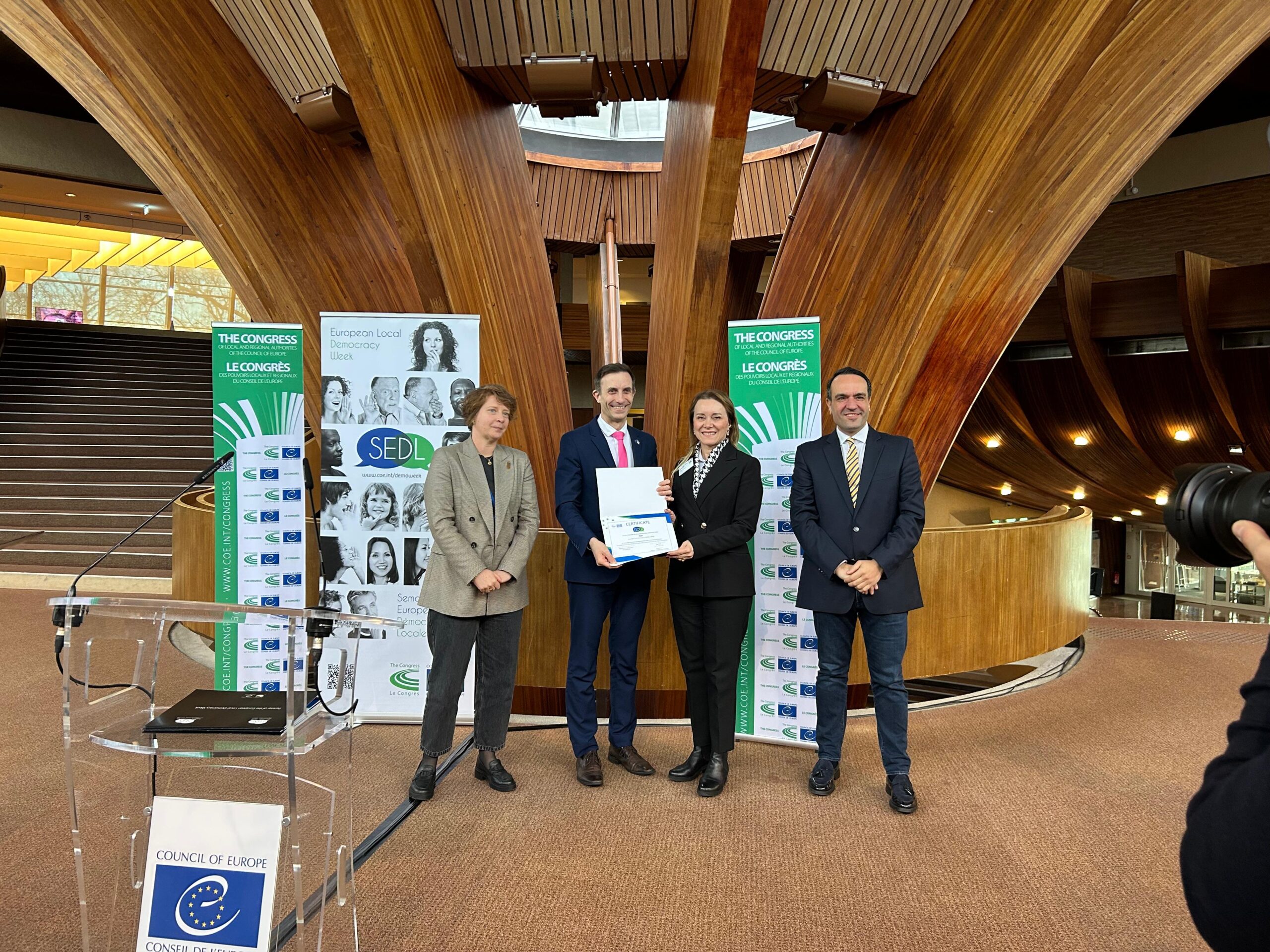 Konak Belediyesi adına ödülü Avrupa Konseyi Yerel ve Bölgesel Yönetimler Kongresi Genel Sekreteri Mathieu Mori’nin elinden alan Başkan Nilüfer Çınarlı Mutlu, katılımcı belediyecilik odaklı yönetim anlayışı ve çalışmalara dair sunum da yaptı.