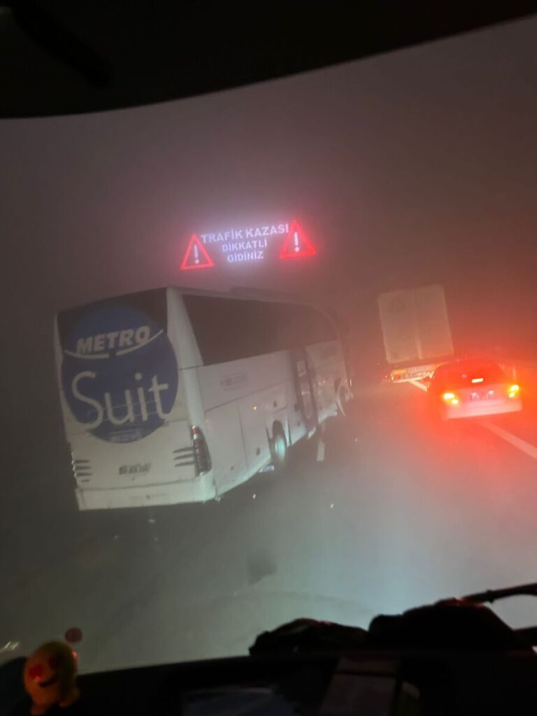 Yoğun sis ve görüşün az olması nedeniyle kaza meydana geldi. Bir TIR, TIR’a vuran bir taksi, akabinde bir otobüs ve bir otobüs daha. Toplamda hepsi 7 araç. Diğerleri bir kamyonet.