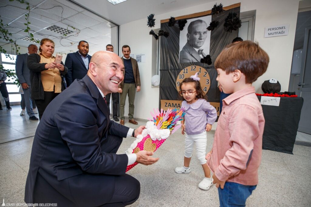 Burada çocuklarla sohbet eden Başkan Soyer, kozalak, duvar süsü gibi öğrencilerin el becerileriyle kendisi için hazırladıkları hediyeleri görünce duygu dolu anlar yaşadı.