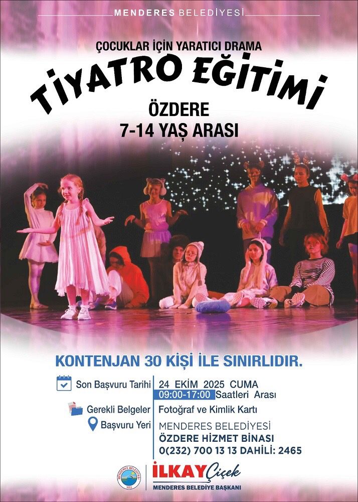7-14 yaş arası çocukların katılabileceği eğitimler Menderes Merkez, Özdere ve Gümüldür olmak üzere üç ayrı bölgede verilecek. Menderes Belediyesi Kültür ve Sosyal İşler bünyesinde gerçekleşen yaratıcı drama tiyatro dersleri için kayıt yerleri; Belediye Merkez Binası Kültür ve Sosyal İşler Müdürlüğü, Özdere Hizmet Binası ve Gümüldür Hizmet Binası olarak duyuruldu.