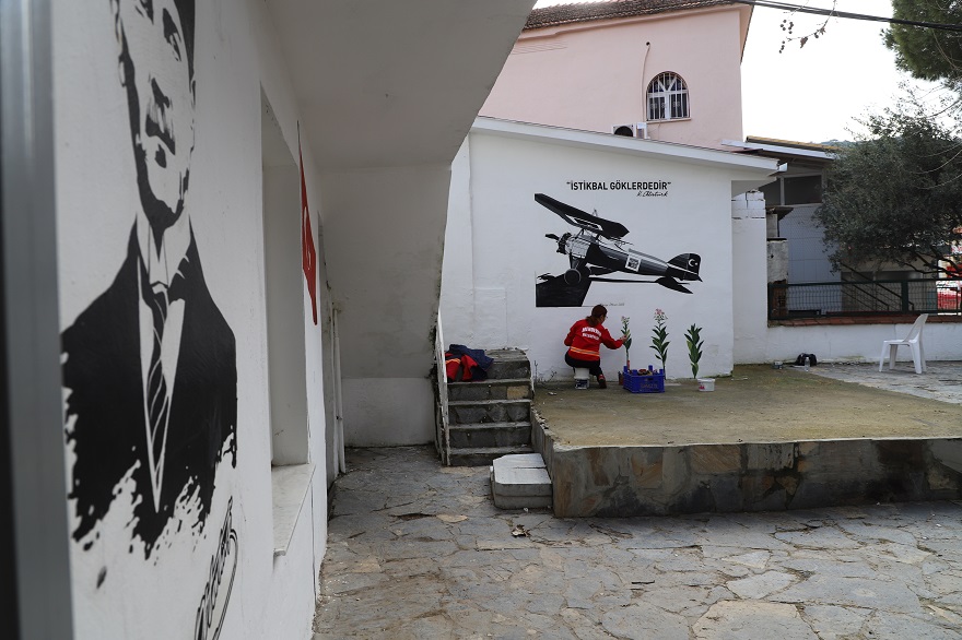 Önce eskizi yapılan çalışmalar daha sonra alana uygulanıyor. Boyama işlemleri Değirmendere Mahallesi meydanında devam ediyor.