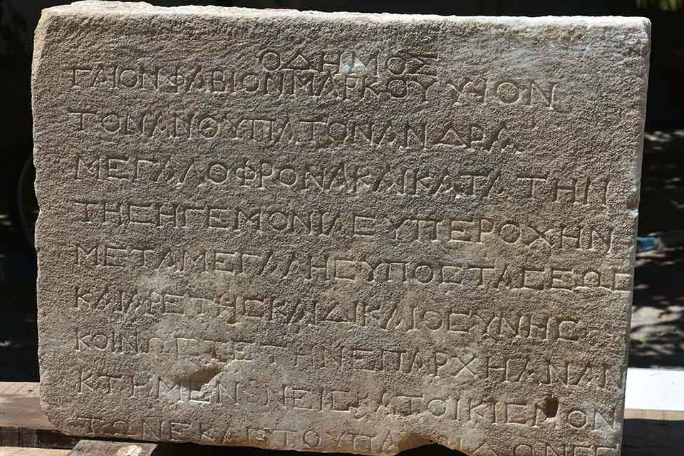 Mermer blok üzerine eski Yunan harfleri ile yazılan, Prof. Dr. Boris Dreyer tarafından çözümlenen metinde; 2 bin yıl önceki Küçük Menderes Ovası’ndaki siyasi ortam ile Roma’nın Asya valisi olarak görev yapmış Gaius Fabius’ün yöneticiliği anlatılıyor.
