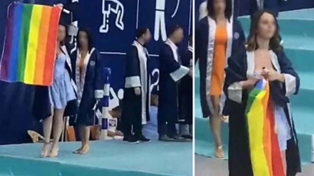 Uşak Üniversitesi öğrencisi Melisa Caymaz, mezuniyet töreni sırasında gökkuşağı bayrağı açarak sahneden indi. Sosyal medya üzerinden hedef oldu.