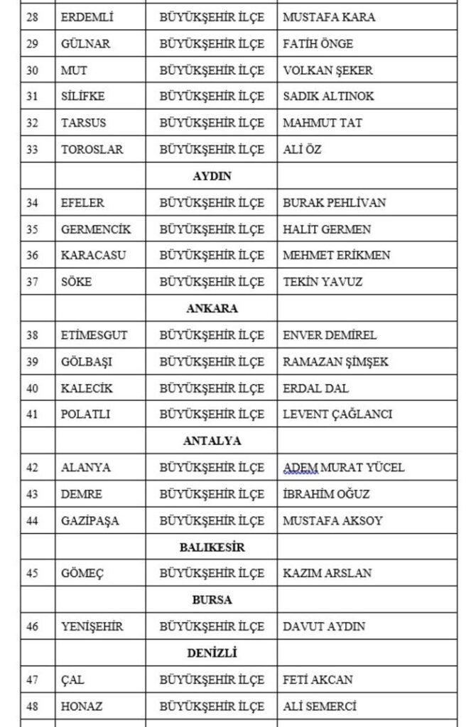 Buna göre Mersin büyükşehir belediye başkan adayı Serdar Soydan olurken, Manisa büyükşehir belediye başkan adayı da Cengiz Ergün olarak açıklandı.