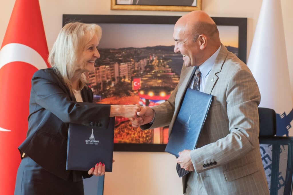 İzmir Büyükşehir Belediye Başkanı Tunç Soyer’in ev sahipliğindeki törende Avrupa İmar ve Kalkınma Bankası Altyapı Sektörü Türkiye Direktörü Sue Barrett ile Büyükşehir Belediyesi bürokratları yer aldı.
