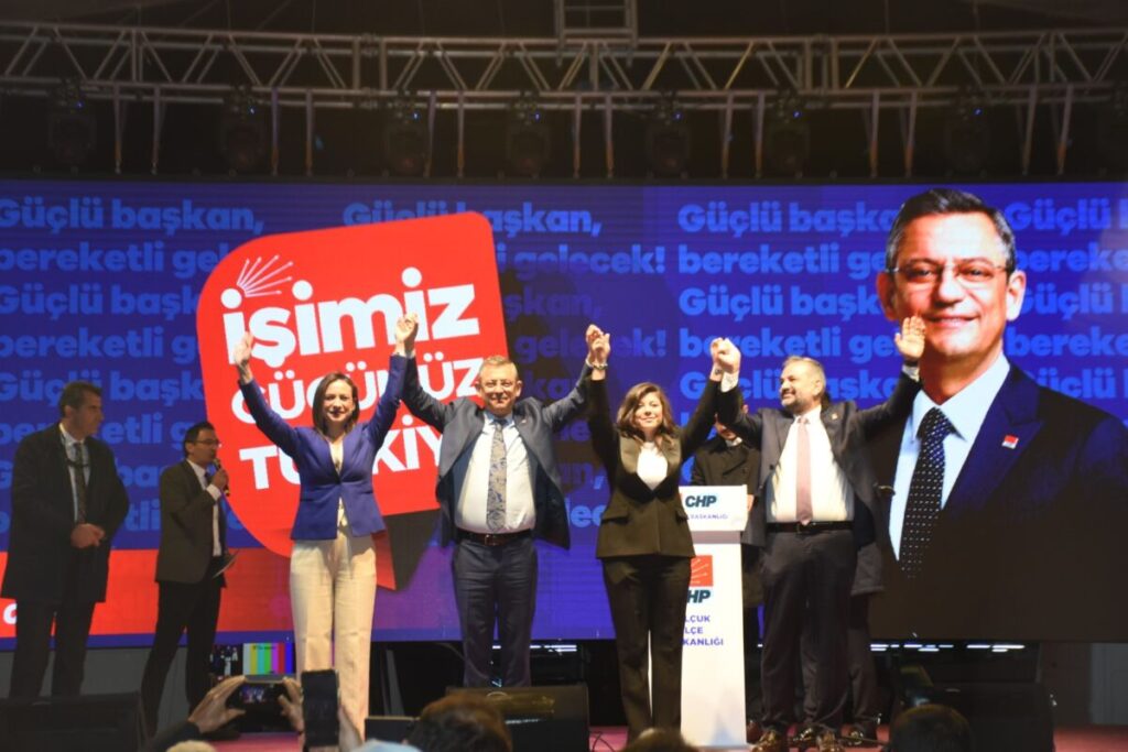 CHP Genel Başkanı Özgür Özel, Selçuk Belediye başkan adayı Filiz Ceritoğlu Sengel’in Selçuk İstasyon Meydanı’nda gerçekleştirilen proje tanıtım toplantısına katıldı.