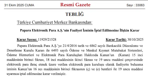 Resmi Gazete’de yayımlanan TCMB kararında, Papara’ya 2016 yılında verilen elektronik para kuruluşu olarak faaliyet izninin, 6493 sayılı Kanun’un ilgili maddeleri uyarınca iptal edildiği belirtildi.