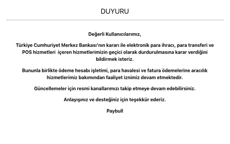 * MB’nin kararıyla elektronik para ihracı, para transferi ve POS hizmetleri içeren hizmetlerimizin geçici olarak durdurulmasına karar verdiğini bildirmek isteriz.