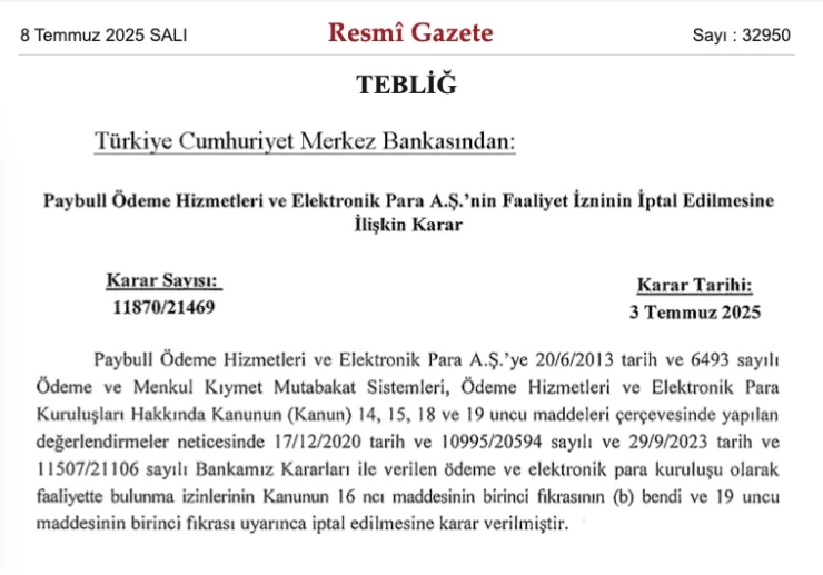“Paybull Ödeme Hizmetleri ve Elektronik Para A.Ş.’ye 20/06/2013 tarih ve 6493 sayılı Ödeme ve Menkul Kıymet Mutabakat Sistemleri, Ödeme Hizmetleri ve Elektronik Para Kuruluşları Hakkında Kanunun (Kanun) 14, 15, 18 ve 19’uncu maddeleri çerçevesinde yapılan değerlendirmeler neticesinde 17/12/2020 tarih ve 10995/20594 sayılı ve 29/9/2023 tarih ve 11507/21106 sayılı Bankamız kararlarıyla verilen ödeme ve elektronik para kuruluşu olarak faaliyette bulunma izinlerinin Kanunun 16’ncı maddesinin birinci fıkrasının (b) bendi ve 19’uncu maddesinin birinci fıkrası uyarınca iptal edilmesine karar verilmiştir.”