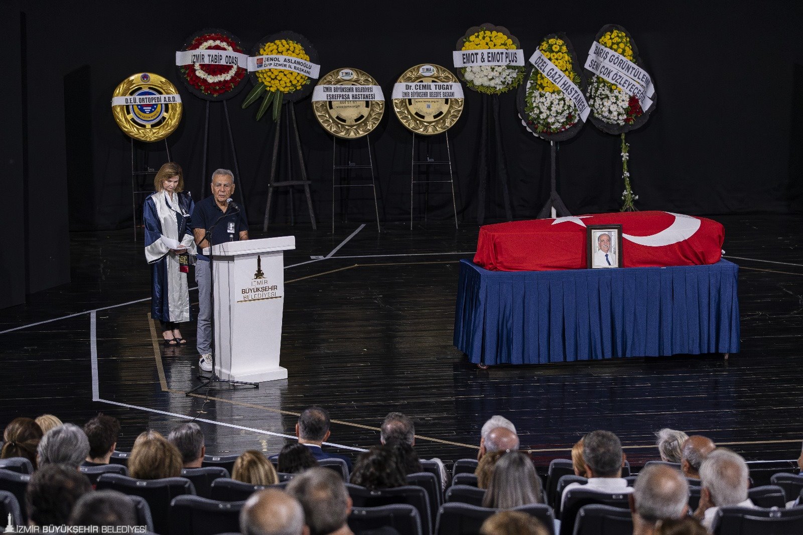 78 yaşında hayatını kaybeden Alıcı için düzenlenen törene eşi Nurdan Alıcı, kızı Esen Alıcı ile oğlu Prof. Dr. Evren Alıcı’nın yanı sıra İzmir Büyükşehir Belediye Başkanı Dr. Cemil Tugay, İzmir Büyükşehir Belediyesi eski Başkanı Aziz Kocaoğlu ile eşi Türkegül Kocaoğlu, İzmir Büyükşehir Belediyesi Genel Sekreter Yardımcısı Prof. Dr. Pınar Okyay, İzmir Büyükşehir Belediye Meclisi CHP Grup Başkan Vekili Altan İnanç, İzmir Büyükşehir Belediyesi Eşrefpaşa Hastanesi Başhekimi Doç. Dr. Başak Bayram, sevenleri, meslektaşları ve tedavi ettiği hastaları katıldı. Konuşmacılar, Emin Alıcı’ya gözyaşları içerisinde veda etti.