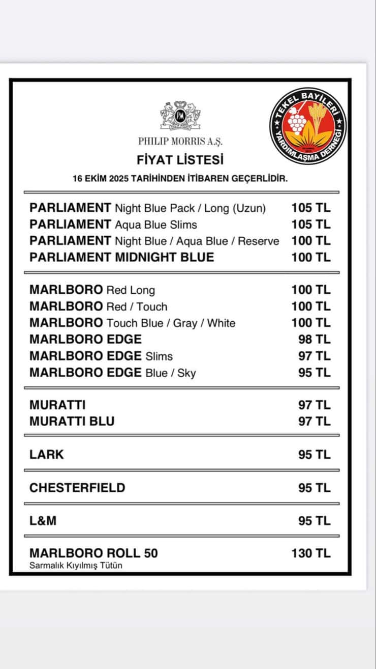 Demokrat Gündem TÜM YAZILARI Giriş: 16-10-2025 12:10Güncelleme: 16-10-2025 12:10 ekonomiEkonomi ABONE OL Tekel Bayileri Yardımlaşma Derneği (TBYD) Başkanı Erol Dündar, zamlı fiyatları X’ten duyurdu: