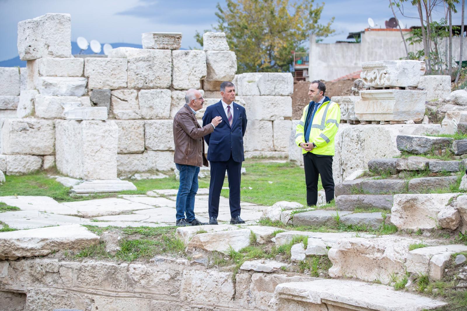 20 bin kişilik kapasitesiyle Efes Antik Tiyatrosu büyüklüğündeki Antik Smyrna Tiyatrosu ile Smyrna Agorası’ndaki Roma dönemi hamamının gymnasium bölümünü gün yüzüne çıkarmak için yoğun bir çaba sarf eden Prof. Dr. Akın Ersoy’un başkanlığındaki ekibi ziyaret eden İzmir Büyükşehir Belediye Başkanı Dr. Cemil Tugay, çalışmalar hakkında bilgi aldı. Başkan Tugay’a İzmir Büyükşehir Belediyesi Genel Sekreter Yardımcıları Prof. Dr. Pınar Okyay ve Dr. Hakan Uzun, İzmir Büyükşehir Belediyesi Kent Tarihi, Tanıtım ve Turizm Dairesi Başkanı Hasibe Velibeyoğlu ile bürokratlar eşlik etti. Prof. Dr. Akın Ersoy, bölgede yaptıkları kazı çalışmaları hakkında Başkan Tugay’a bilgi vererek burada düzenlenecek etkinliklerin alana ilgiyi artıracağını söyledi. İzmir Büyükşehir Belediyesi Kent Tarihi, Tanıtım ve Turizm Dairesi Başkanı Hasibe Velibeyoğlu ve İzmir Büyükşehir Belediyesi Kent Tarihi, Tanıtım ve Turizm Dairesi Başkanlığı Tarihsel Çevre ve Kültür Varlıkları Şube Müdürü Hilmi Gökhan Kutlu alanın planlarını anlattı.
