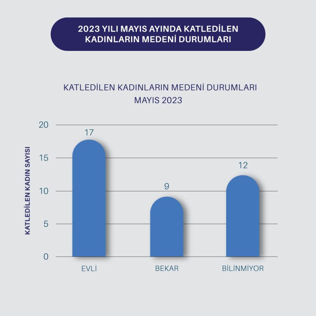 TKDF’nin açıkladığı verilere göre, öldürülen kadınların 17’sinin evli iken öldürüldüğü; 9’unun ise bekarken öldürüldüğü belirtildi. Erkek şiddetine kurban giden kadınlardan 12’sinin ise medeni durumu bilinmiyor.
