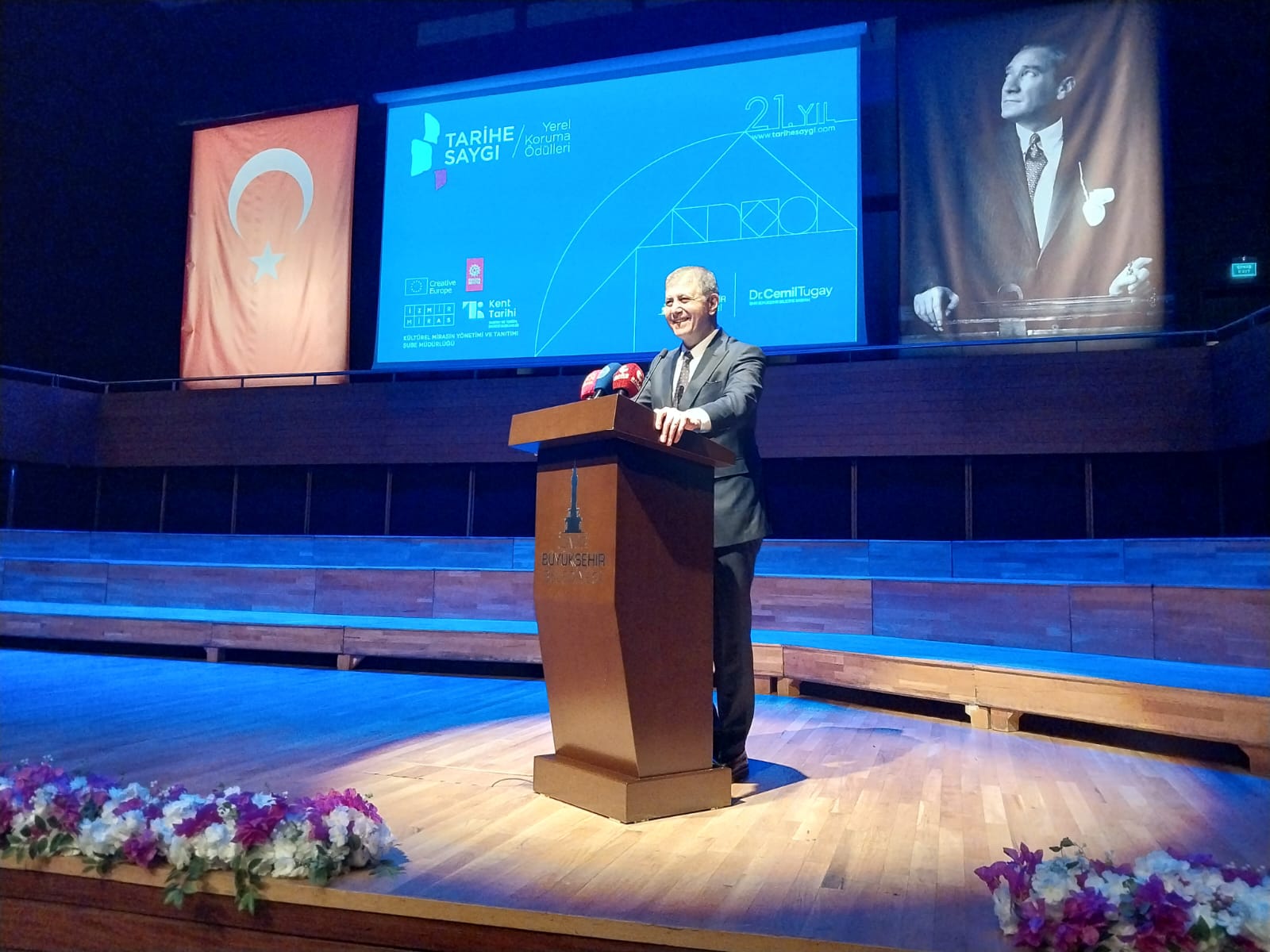 Ödül töreninde konuşan Başkan Dr. Cemil Tugay, koruma kültürüne getirdiği insani bakış açısıyla dikkat çekti. Tugay, tarihi korumanın binaları onarmaktan öte, kentin hafızasını ve yaşanmışlıklarını korumak anlamına geldiğini vurguladı.