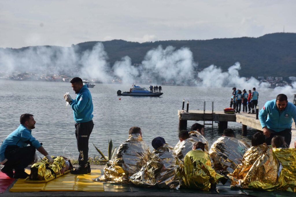 Acil Sağlık Hizmetleri Daire Başkanı Ali Özbudak tatbikata ilişkin, “Ulusal Medikal Kurtarma Ekiplerimiz, Sağlık Bakanlığımızın sağlık hizmetinde çalışan gönüllü personellerinden oluşuyor. Her yıl ülkemizde oluşabilecek afetlerle ilgili Türkiye Afet Müdahale Planları çerçevesince her bölgenin bir tane saha tatbikatı gerçekleştirmesi gerekmektedir. Tatbikatı yapma amacımız diğer paydaş kurumların imkanlarını, kabiliyetlerini görmek. Bugünkü tatbikatta bulunduğumuz bölgede denizden 3 kilometre açıkta bir deprem gerçekleşiyor. Deprem sonucu 25 kişilik bir tekne alabora oluyor. 112 Acil Çağrı Merkezi’ne çağrı düşüyor. Komuta kontrol merkezi, acil çağrı merkezi tarafından paydaş kurumlara anında bu yardım taleplerini iletiyor. Öncelikle hava yolundan ve kara yolundan, arkasından da deniz yolundan kurtarma konusunda profesyonel, tecrübeli, deneyimli paydaş kurumlarımız ve Ulusal Medikal Kurtarma Ekip (UMKE) gönüllülerimiz aynı zamanda ulaştılar. Kendi imkanıyla her zaman olduğu gibi çıkan bir kısım yaralı oluyor. Biz onlara ‘yeşil kodlular’ diyoruz. Kendileri yürüyebiliyor. Onun dışında denizin ortasında botlarla kurtarılanlar ve hava yoluyla kurtarılanların kıyıya güvenli şekilde nakilleri sağlanıyor. Gerçek hayatta da bunu yapmayı hedefliyoruz ve gerçekten de şu an yapabiliyoruz” dedi.