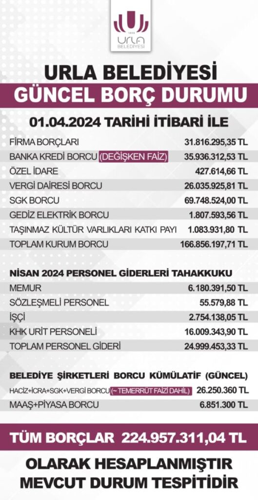 Urla Belediye Başkanı Yüksek Mimar Selçuk Balkan, 31 Mart Yerel Seçimleri sürecinde göreve geldikten sonra verdiği vaatlerinden biri olarak belediyenin beyaz duvarına borçlarının yer alacağı mali tabloyu asacaklarını belirtmişti. Asılan pankartta Belediyenin toplamda 224 milyon 957 bin 331 TL borcunun olduğu Belediyenin mevcut kayıtlarından alınarak kamuoyuna bildirildi.
