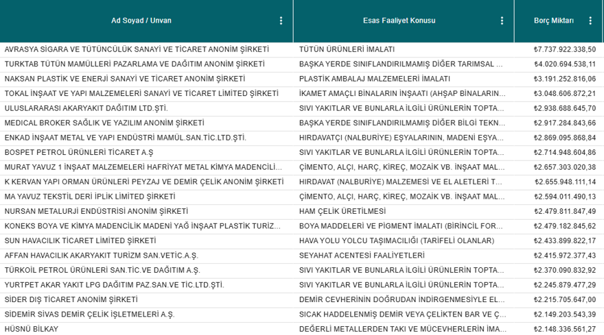 Borçlular listesinin ilk sırasında 7 milyar 737 milyon 922 bin lirayla Uray Vergi Dairesine kayıtlı Avrasya Sigara ve Tütüncülük Sanayi ve Ticaret AŞ yer aldı. Bu şirketi, 4 milyar 20 milyon 695 bin lirayla Turktab Tütün Mamülleri Pazarlama ve Dağıtım AŞ ve 3 milyar 191 milyon 253 bin lirayla Naksan Plastik ve Enerji Sanayi ve Ticaret AŞ takip etti.